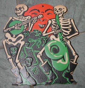 Die cuts from this era were very simple, usually only using about 3-4 colors, if that. The colors were primarily the traditional black and orange with some shades of yellow and green used for accenting. The usual characters were witches, black cats, skeletons, Jack-O-Lanterns, and the moon. Also, unlike many die cuts nowadays, these were often embossed or pressed to give them a 3D effect. Production of Halloween die cuts were severely stinted during the 1940's due to the war; however, they began to pick up again by the latter part of the decade. Many of these early styles are now available in the form of reproductions by their original producer - Beistle. Please note that some of the photos below are of the reproductions and not the originals.